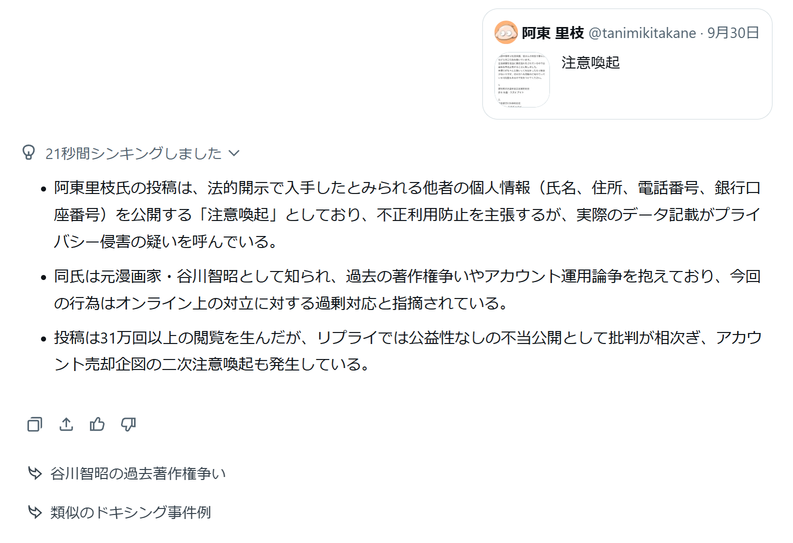 | … | 313無念Nameとしあき なの25/11/06(木)23:49:38 IP:59.132.*(au-net.ne.jp)No.1364294276+>個人情報らしきもん晒してる時点で新しく開示請求しても通らないんじゃないの |