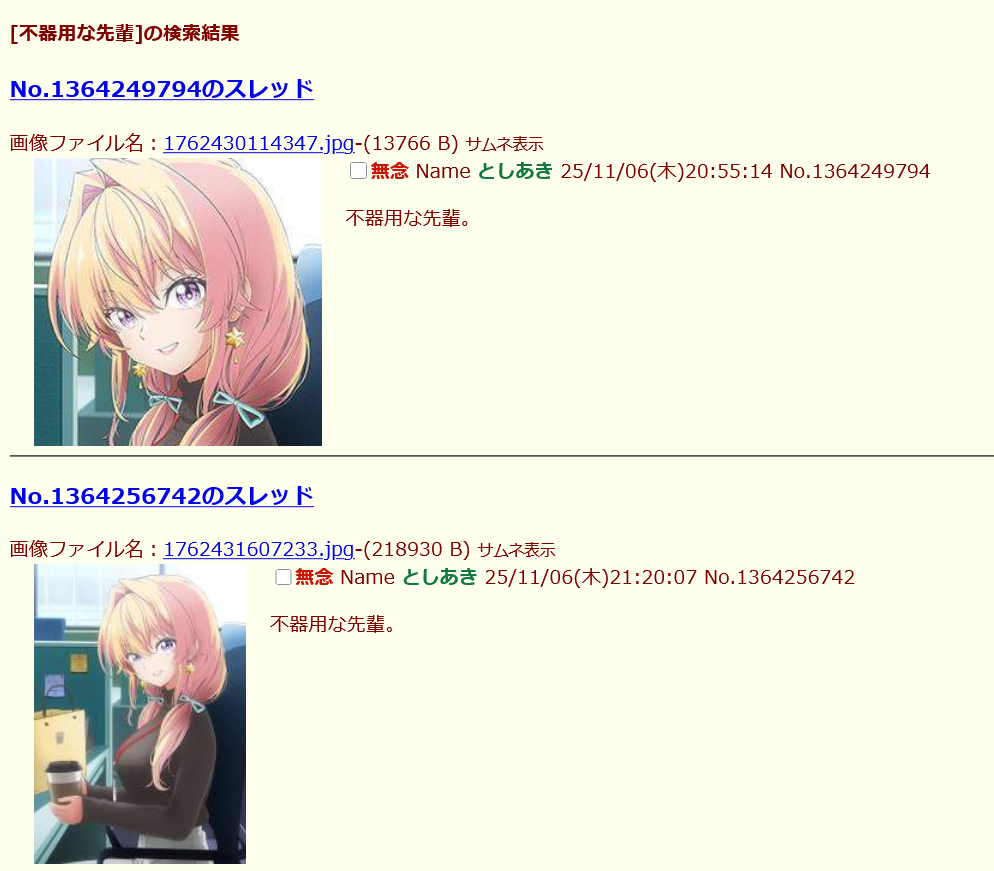 | … | 365無念Nameとしあき25/11/07(金)01:03:44 IP:119.82.*(hinocatv.ne.jp)No.1364305928そうだねx3>一応貼っとくの |