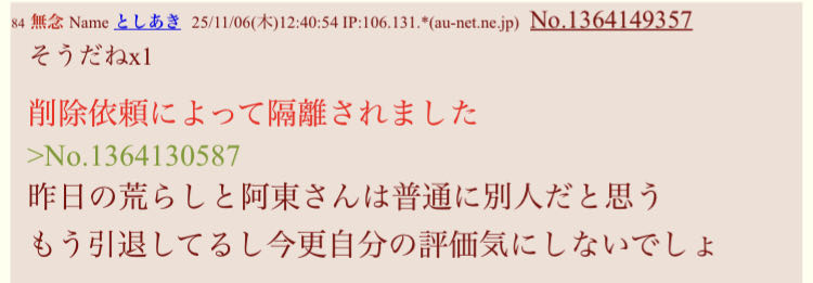 | … | 83無念Nameとしあき25/11/06(木)21:46:01 IP:113.43.*(arteria-hikari.net)No.1364263708そうだねx10削除依頼によって隔離されました |