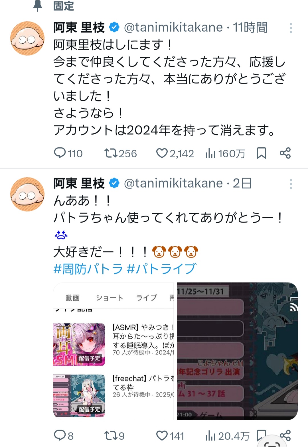 | … | 314無念Nameとしあき pg25/11/06(木)23:50:50 IP:106.146.*(au-net.ne.jp)No.1364294488そうだねx8でなんで自分を守ってくれるフォロワーを黙って金に換えようとしてるの? |