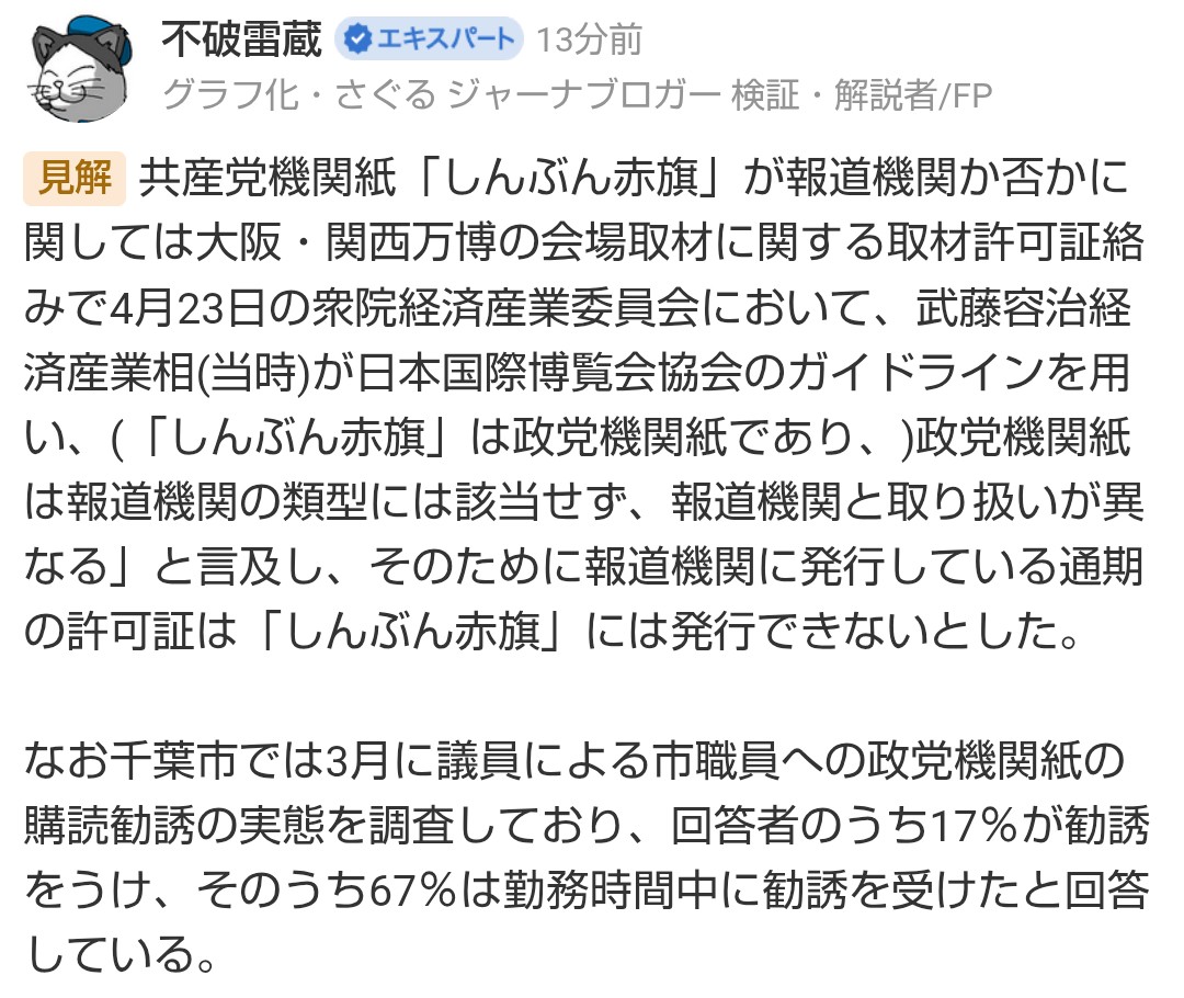 | … | 44無念Nameとしあき25/11/06(木)22:10:49No.1364270731そうだねx4>赤旗の記者って党関係者だろうし名刺晒したところで何か問題あるのか? |