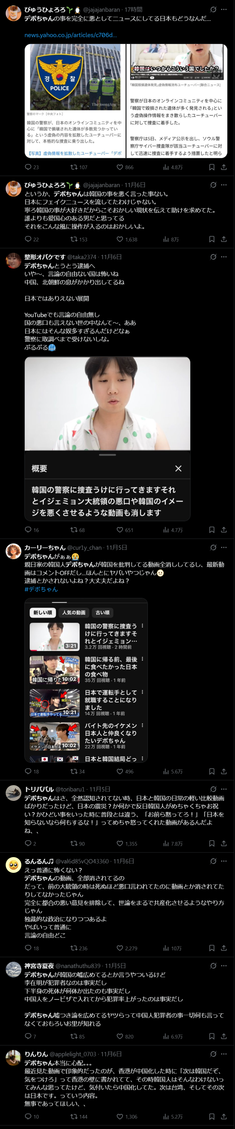 韓国人YouTuber「国民の不安を煽る発言をした」として現地警察が捜査に着手このスレは古いので、もうすぐ消えます。