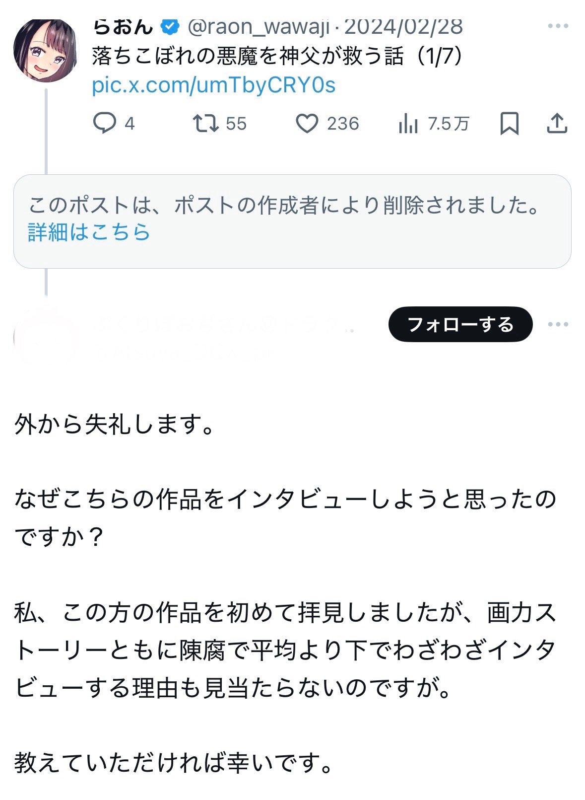 | … | 847無念Nameとしあき25/11/07(金)15:33:53No.1364392445そうだねx1>「(セルフ)打切り」はとしあきがそう呼んでるだけで先生が自分でそう言ってるわけじゃなかったはず |