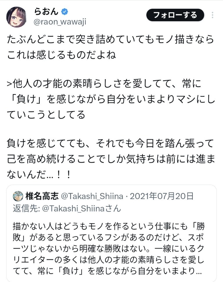 | … | 53無念Nameとしあき25/11/07(金)08:03:07No.1364327206そうだねx5正直画力よりまず大事なのは情熱だと思うけどなぁ |