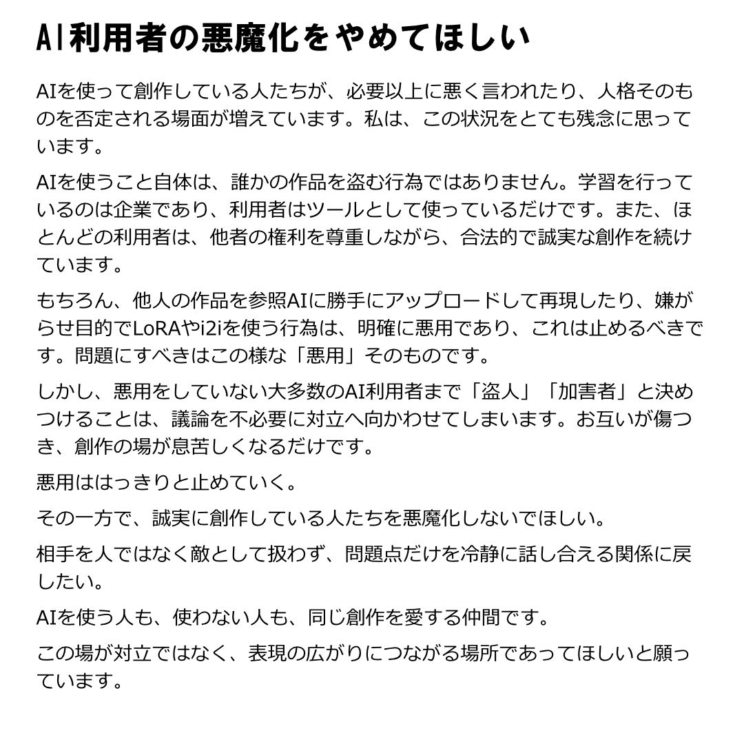 | … | 932無念Nameとしあき25/11/07(金)16:30:48No.1364401074+>現行の生成AIの運用と学習方法が今のままだと他の分野と文化を殺すことになるから |