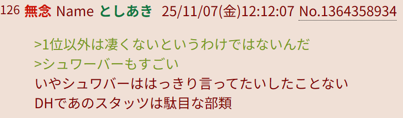 | … | 61無念Nameとしあき25/11/07(金)11:35:20No.1364353058そうだねx8>選手間シュワバーはマジでお情けだな |