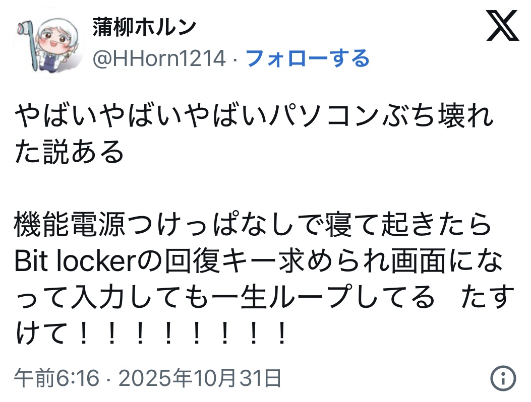 | … | 349無念Nameとしあき25/11/07(金)19:59:18No.1364446815+致命的と言ってもBitlockerの罠を踏み抜いた上で回復キーを紛失する間抜けかつ障害発生時にデータのサルベージをしようと思った人物限定の問題でしょ |