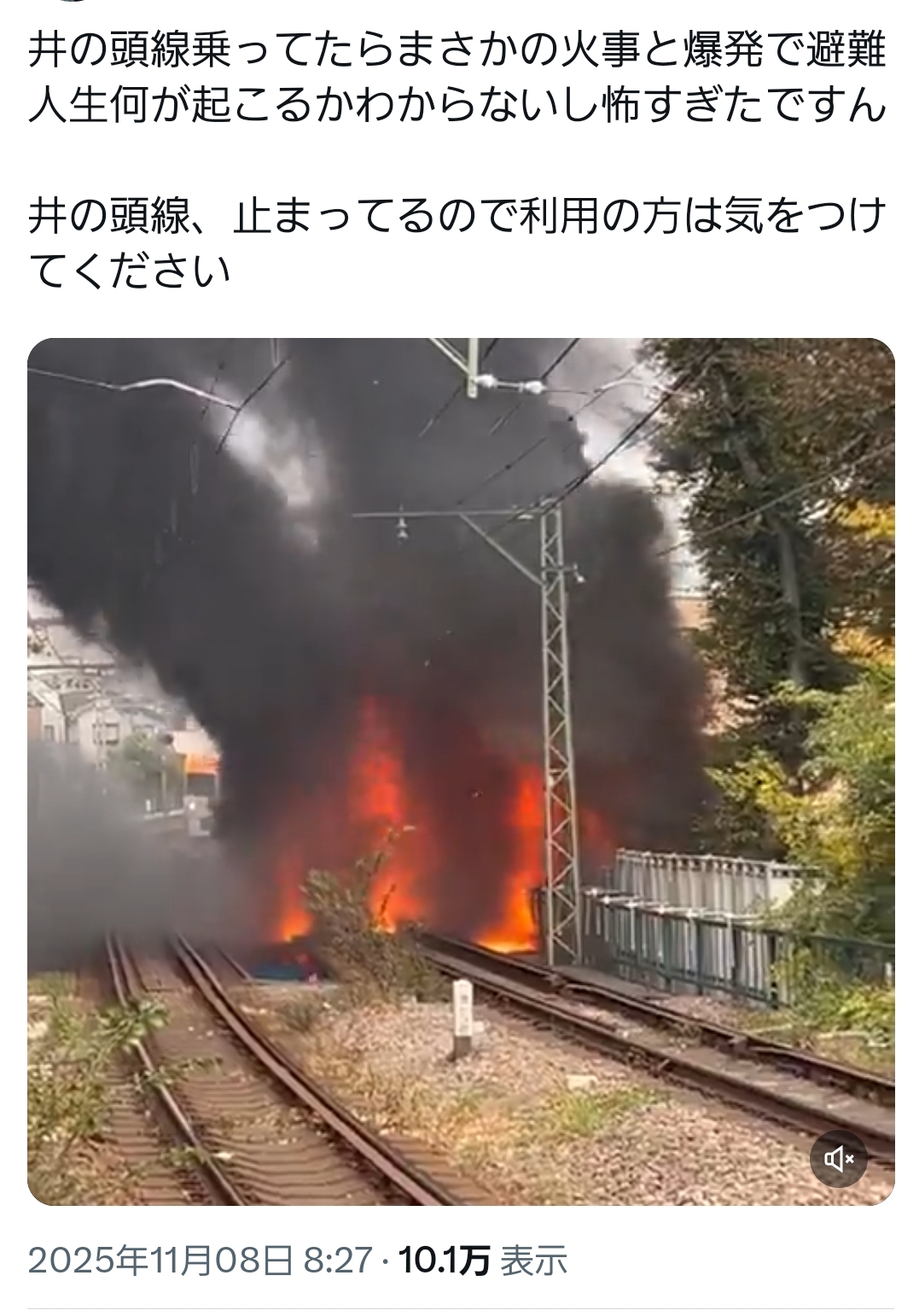 | … | 5無念Nameとしあき25/11/08(土)09:45:27No.1364567577+>井の頭線で沿線火災か…しばらくすれば安全確認して再開かなと軽く見積もっていたら完全に線路まで燃えてしまってこれ復旧に数日かかるやつ |