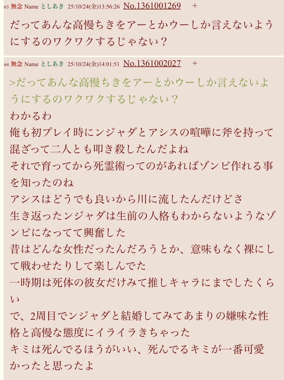 | … | 46無念Nameとしあき25/11/08(土)13:59:24No.1364615265+>他ゲーや漫画なんかは獣姦嫌いだけど |