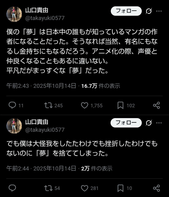 | … | 52無念Nameとしあき25/11/08(土)14:38:23No.1364623052そうだねx2>アニメ化したヒット作を何本も出してるお人でもこういう事思ってるんだ… |