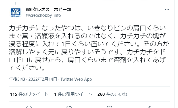 | … | 97無念Nameとしあき25/11/10(月)22:57:33No.1365261310+>久々に使おうと思った塗料がゲル化してたから溶媒液で溶かした |