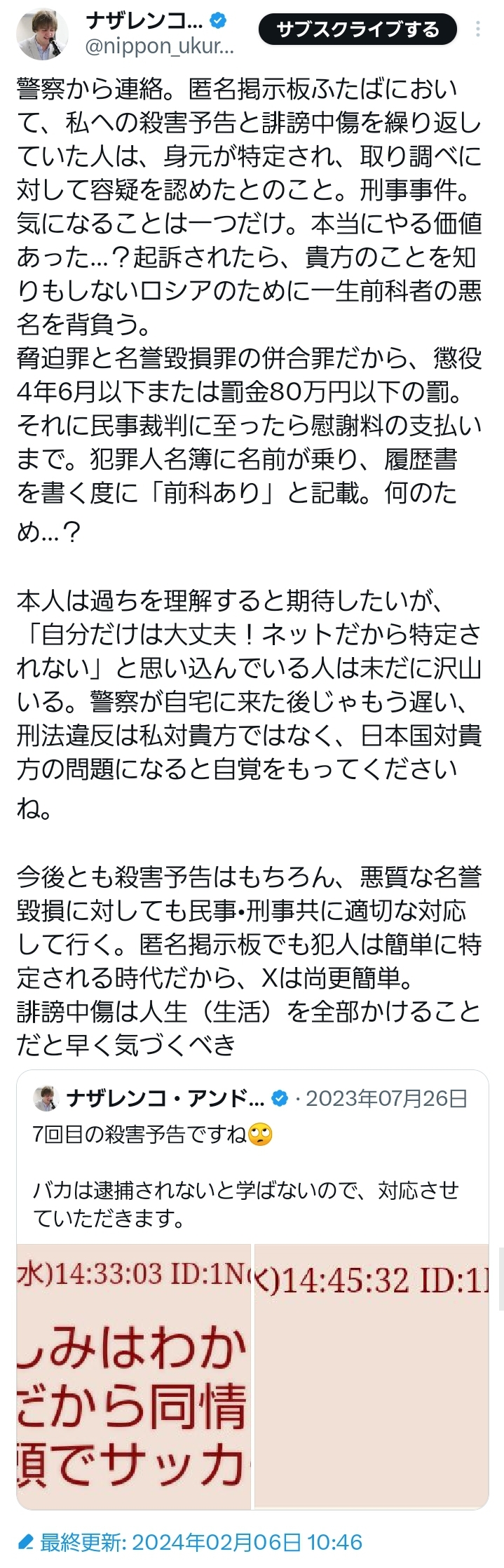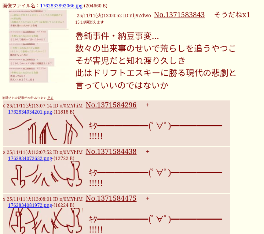 | … | 72無念Nameとしあき25/11/11(火)14:38:38No.1365362683+>今回の削除はタイミングを考えると警察案件だと思うよ |