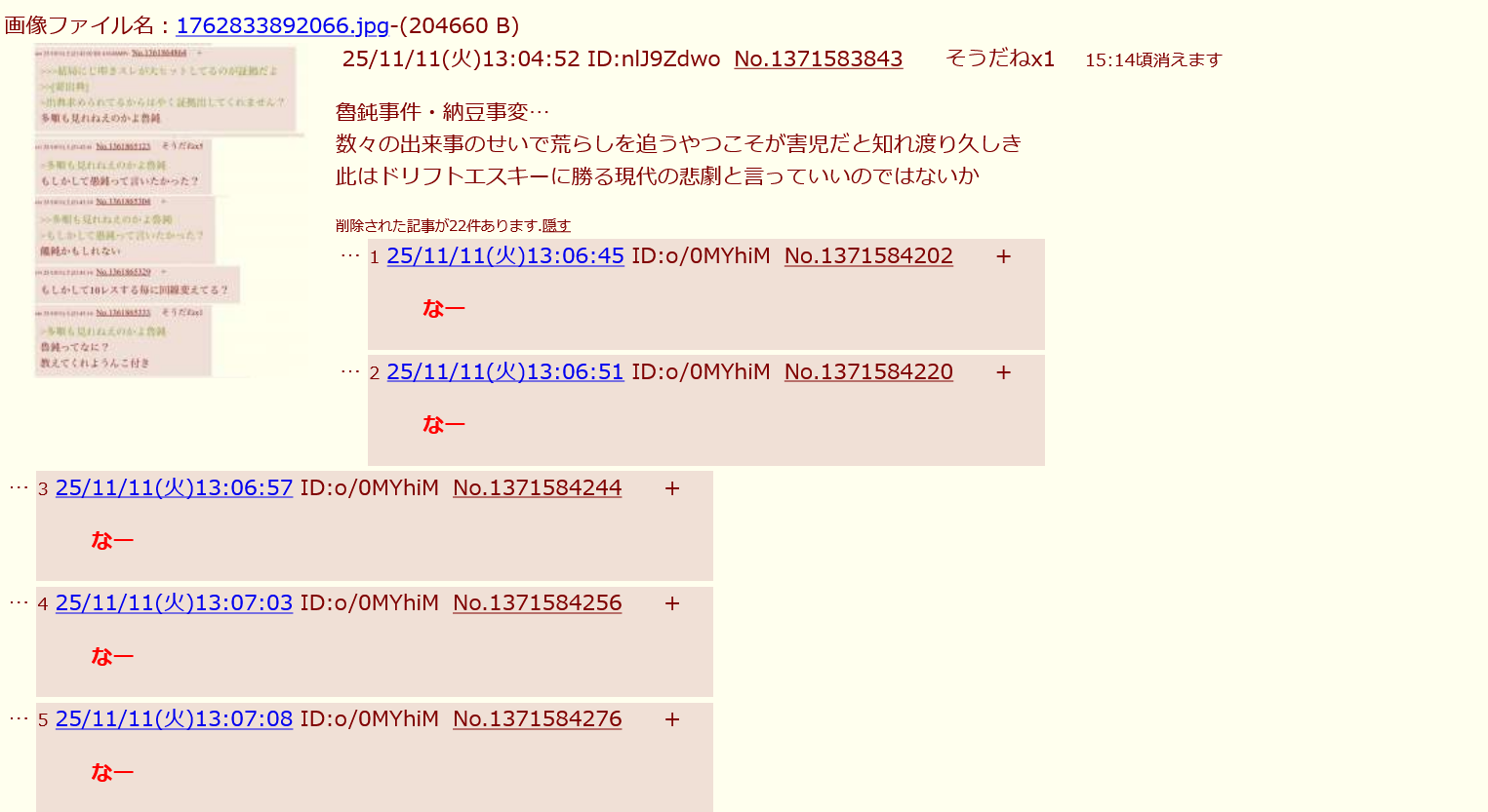 | … | 22無念Nameとしあき25/11/11(火)14:16:26No.1365359600そうだねx4>ID:XBxQhfSo |