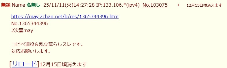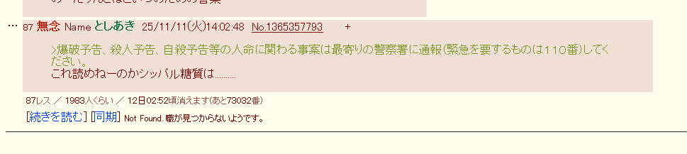 | … | 4無念Nameとしあき25/11/11(火)14:10:25No.1365358806そうだねx6さっきの殺害予告スレ落ちたね |