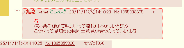 | … | 14無念Nameとしあき25/11/11(火)14:12:40No.1365359093そうだねx9>俺も栗ご飯が美味しいって流れはおかしいと思う |