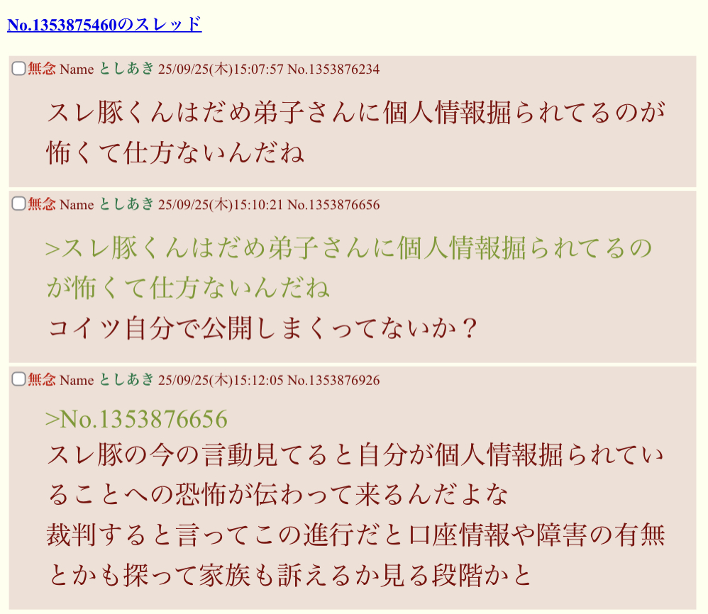 | … | 39無念Nameとしあき25/11/11(火)14:21:54No.1365360327そうだねx14>スレ豚のいつもの殺害予告スレが管理人さんに消されちゃったね… |