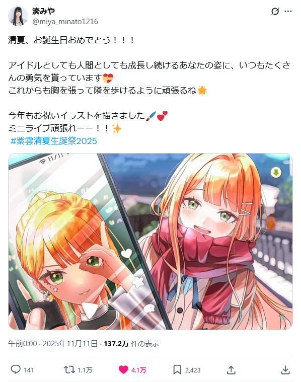 | … | 49無念Nameとしあき25/11/11(火)21:51:26No.1365458075+>今日は楓さんの世界のアイドルの紫雲清夏ちゃんの誕生日や |