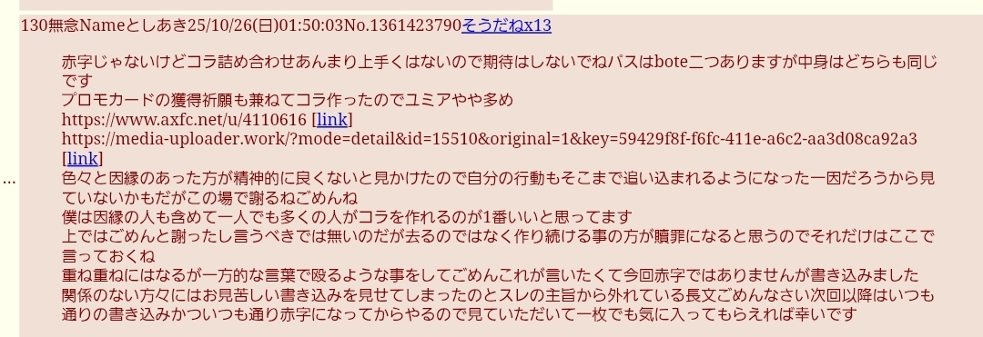 | … | 76無念Nameとしあき25/11/12(水)00:00:03No.1365490923そうだねx2>このスレに貼られているコラ画像全部ど下手で引くわ |