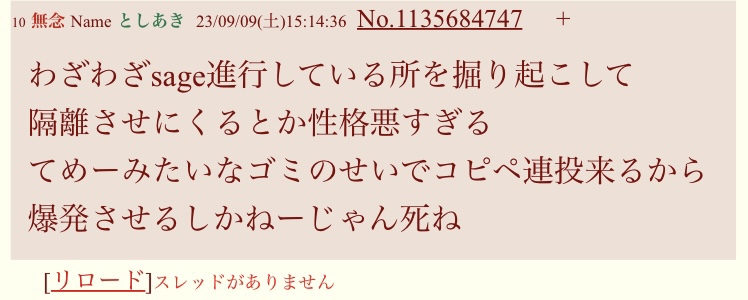 | … | 169無念Nameとしあき25/11/12(水)00:42:59No.1365498915そうだねx2自演バレが自爆したって認識なら消えろよウンコマン |