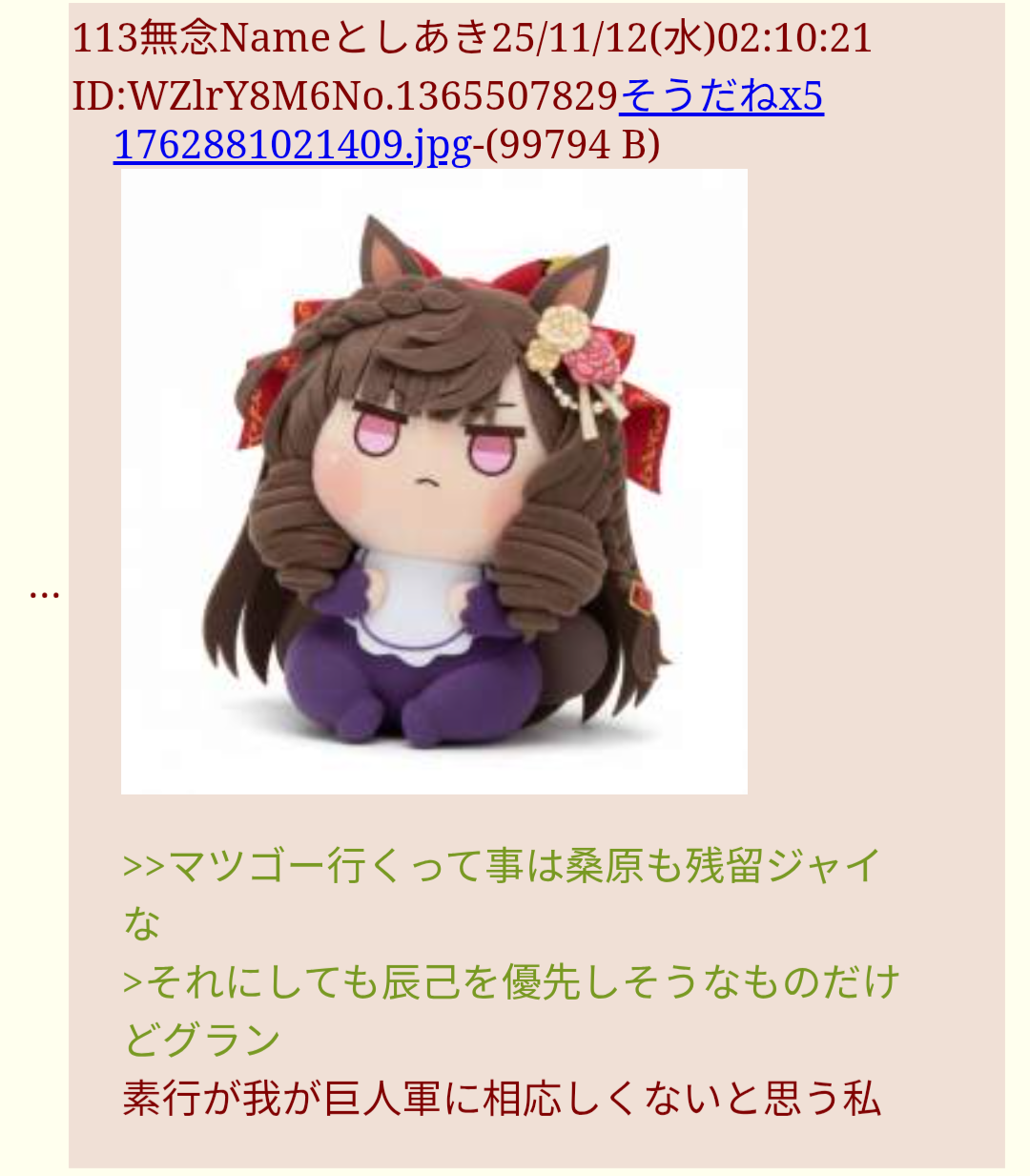 | … | 79無念Nameとしあき25/11/12(水)17:53:27No.1365619738そうだねx1>熊谷様がフルで出てればワンチャンGGあったかもしれませんわ? |