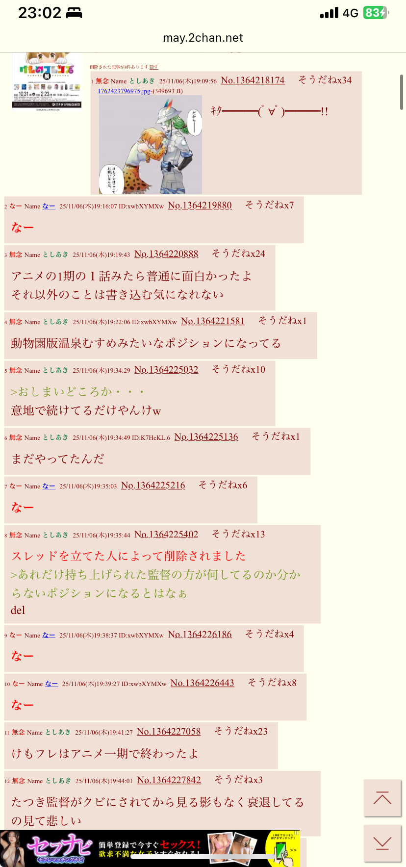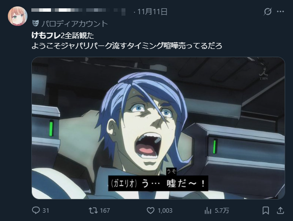 | … | 66無念Nameとしあき25/11/12(水)18:45:32No.1365631869+>けもフレ1の直接の続きは見たいけどな |