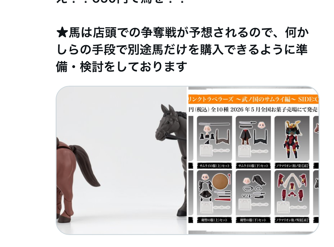 | … | 509無念Nameとしあき25/11/12(水)21:58:20No.1365686053+>冷静に考えると食玩の馬ふたつよりキャラセレの馬が高いのか… |