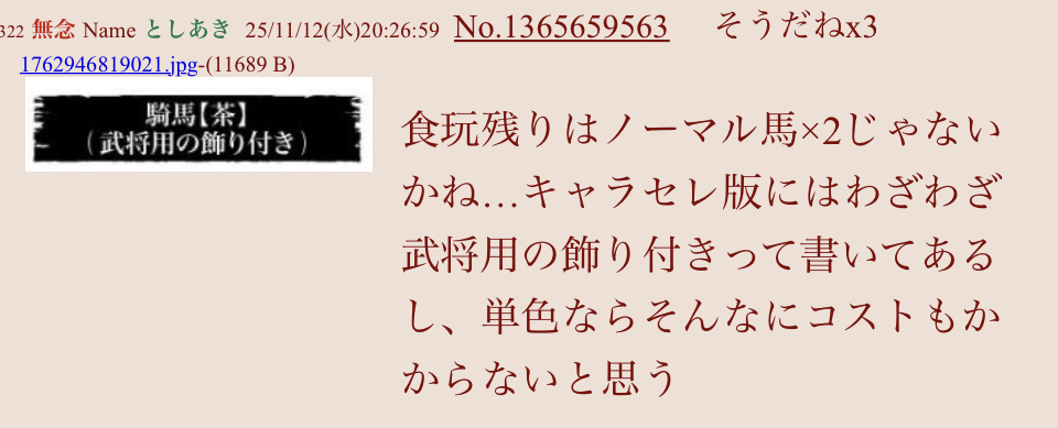 | … | 584無念Nameとしあき25/11/12(水)22:53:47No.1365701283+馬はプレバン辺りで別売りするんかのう… |