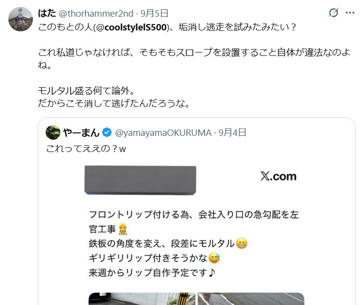 | … | 60無念Nameとしあき25/11/13(木)19:54:58No.1365869488そうだねx7公道に出てるスロープ自体が本来はアウトだけど撤去可能って時点で見逃されてるわけだからな |