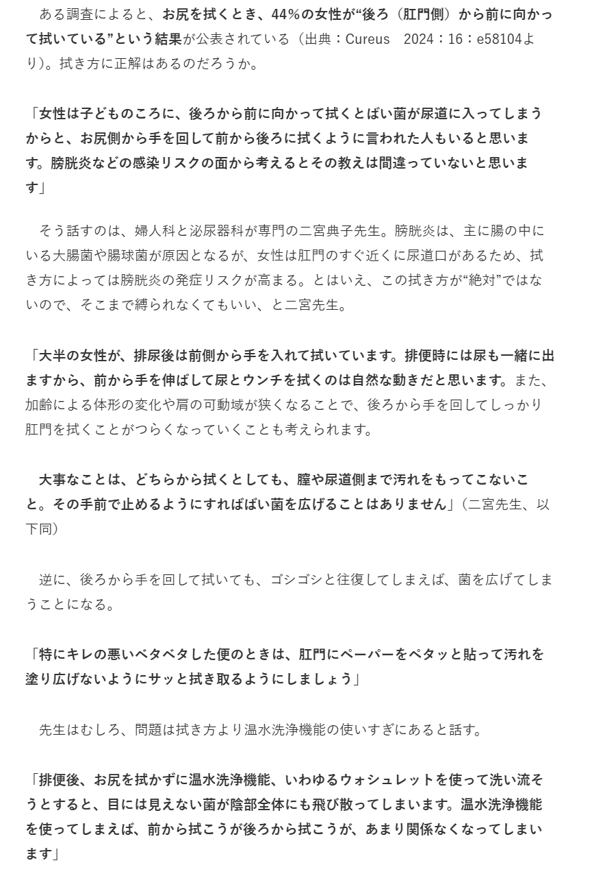 | … | 252無念Nameとしあき25/11/14(金)11:36:54No.1365999701+>逆なんよ男はちんこだから後ろから拭きあげられるけどまんこだと前に拭きあげると感染症になりやすい |
