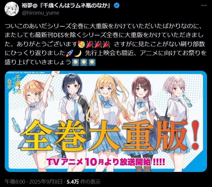 | … | 216無念Nameとしあき25/11/14(金)15:45:58No.1366042056+ 1763102758250.jpg-(133119 B) アニメ放送前に公表につき大重版をかけたはずなのに本屋ではアニメ放送の帯は最新刊にしかついてなかった |