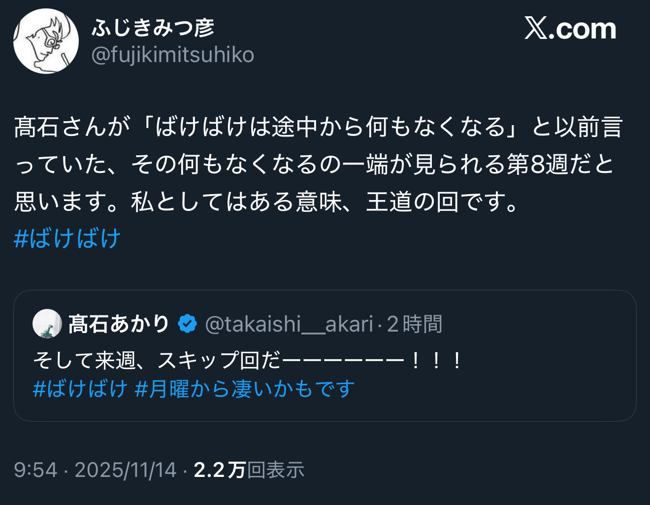 | … | 8無念Nameとしあき25/11/14(金)08:00:31No.1365972524+金曜日答え合わせの回 |
