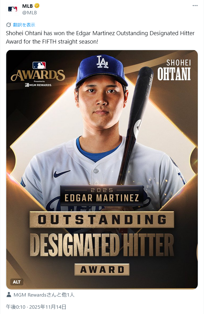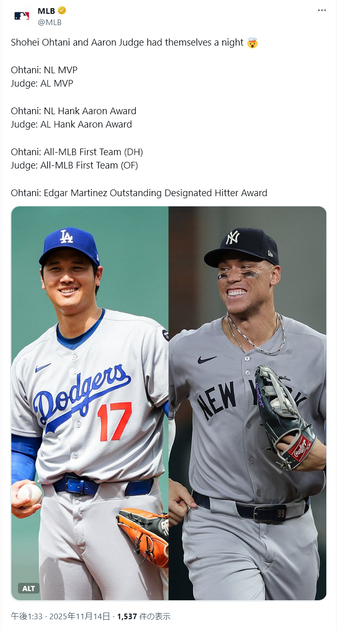 | … | 691無念Nameとしあき25/11/14(金)16:06:36No.1366045409そうだねx7 1763103996844.webp-(114354 B) >大谷が連続受賞ということは大谷が独占している間他の選手は受賞できないということなんですね |