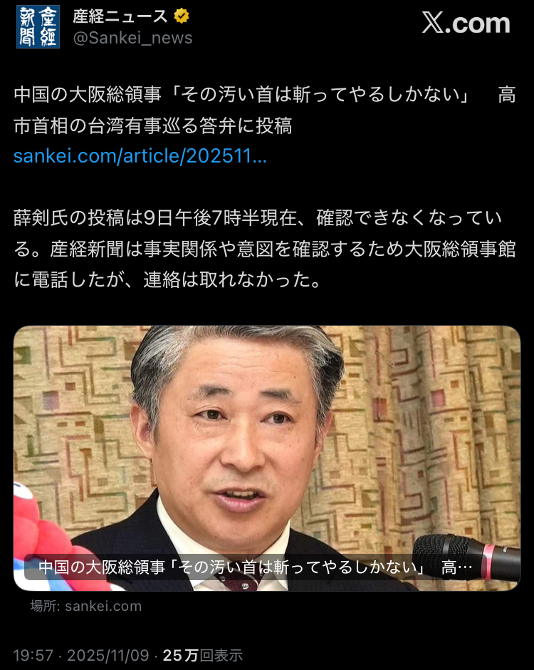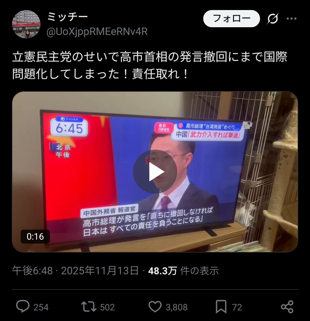 | … | 965無念Nameとしあき25/11/14(金)17:44:53No.1366061697+中国側のツイート、完全に民間人巻き込んで虐殺する気満々でしょ |