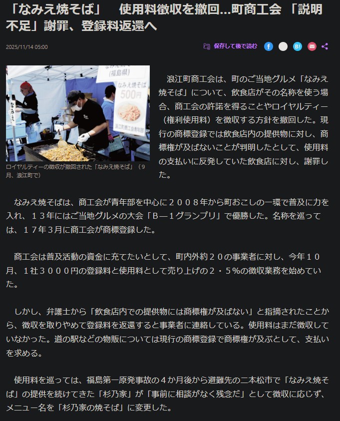 | … | 1無念Nameとしあき25/11/15(土)17:08:53No.1366301998そうだねx5福島県の浪江町商工会が11月14日、商標権を持つ『なみえ焼そば』の名称使用時に飲食店からロイヤリティーを徴収する方針を撤回したことが明らかになりました。 |