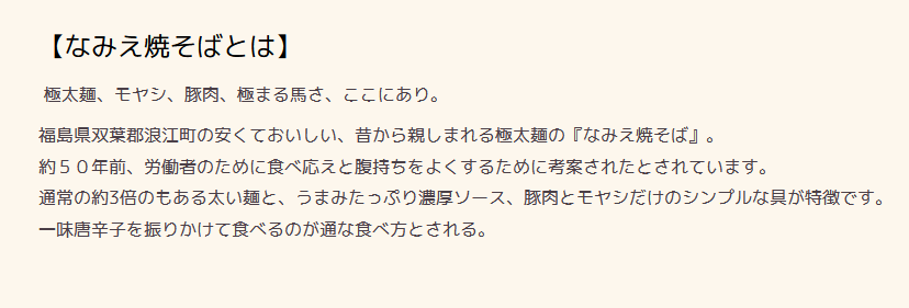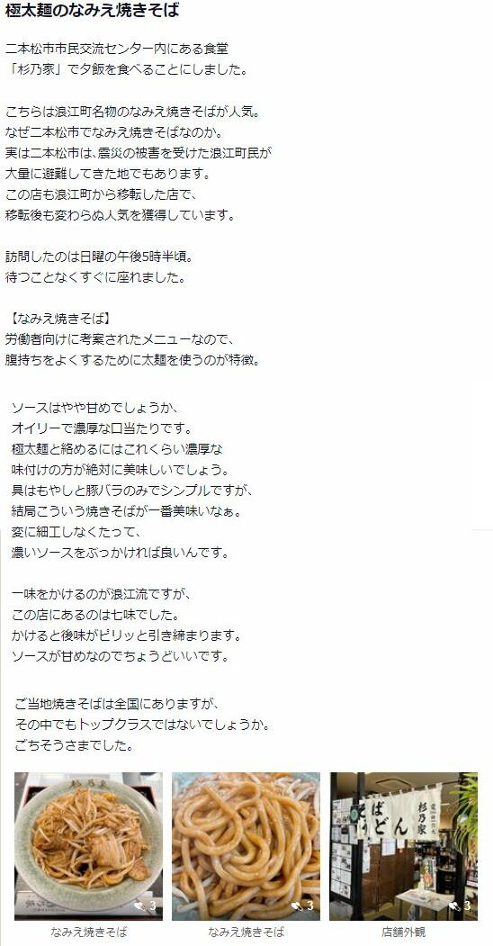 | … | 947無念Nameとしあき25/11/15(土)21:39:33No.1366380549+>>>浪江町商工会は町おこしのための普及事業の活動資金として、10月より『なみえ焼そば』の売上の2.5%の徴収を開始。これにより、2011年の東日本大震災より前から提供を続けていた杉乃家が名称変更を選択せざるを得ない事態に。 |