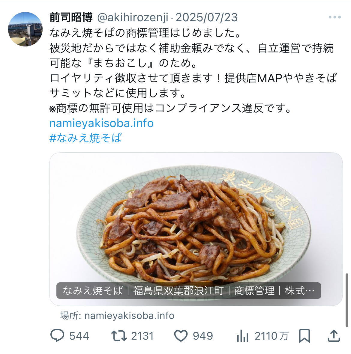 | … | 11無念Nameとしあき25/11/15(土)17:37:57No.1366308341そうだねx40>>浪江町商工会は町おこしのための普及事業の活動資金として、10月より『なみえ焼そば』の売上の2.5%の徴収を開始。これにより、2011年の東日本大震災より前から提供を続けていた杉乃家が名称変更を選択せざるを得ない事態に。 |