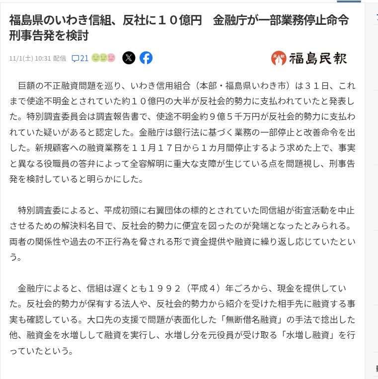 | … | 861無念Nameとしあき25/11/15(土)21:08:45No.1366370737+いわきだけど信用組合が反社の食い物にされてたり 復興費用目当てに胡散臭い連中がシノギの匂いにつられていっぱい来てる |