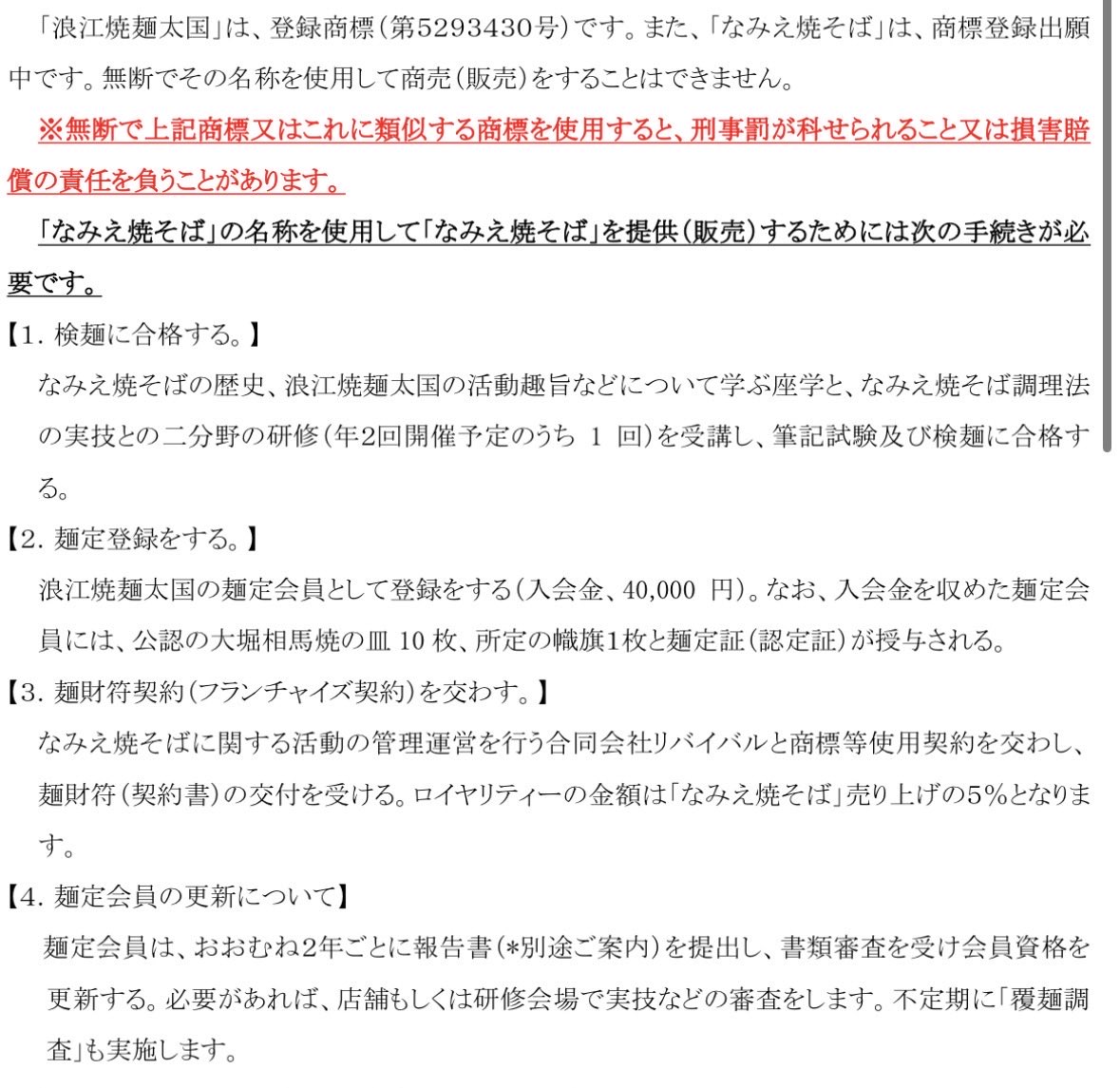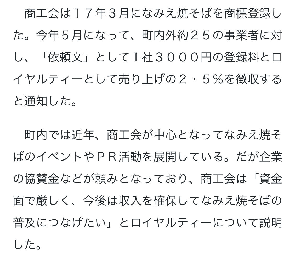 | … | 57無念Nameとしあき25/11/15(土)18:09:54No.1366316000そうだねx30>弁護士から「飲食店内での提供物には商標権が及ばない」と指摘されたことから、徴収を取りやめて登録料を返還すると事業者に連絡している。使用料はまだ徴収していなかった。道の駅などの物販については現行の商標登録で商標権が及ぶとして、支払いを求める。 |