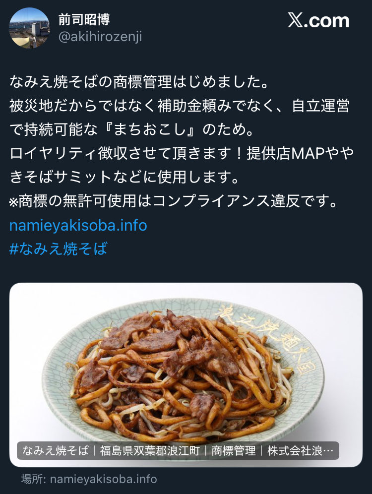 | … | 2無念Nameとしあき25/11/15(土)17:09:26No.1366302120そうだねx7浪江町商工会は町おこしのための普及事業の活動資金として、10月より『なみえ焼そば』の売上の2.5%の徴収を開始。これにより、2011年の東日本大震災より前から提供を続けていた杉乃家が名称変更を選択せざるを得ない事態に。 |