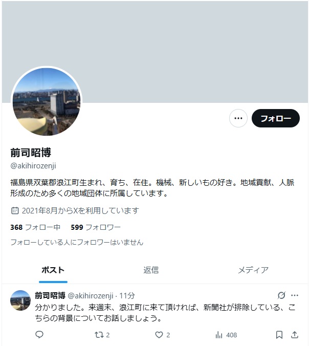 | … | 908無念Nameとしあき25/11/15(土)21:29:03No.1366377211そうだねx3あの駅前空き地だらけの浪江町から擁護派と反対派が同時に繋いでレスバしてると思うとなんかシュール |