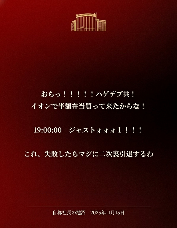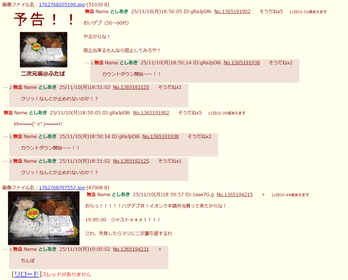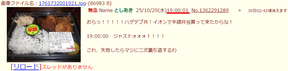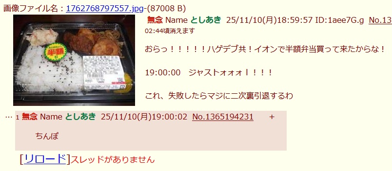 | … | 17無念Nameとしあき25/11/15(土)19:04:05No.1366331035そうだねx1>俺ハゲデブ!イオンで半額弁当買えなかったからな! |