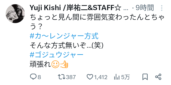 | … | 302無念Nameとしあき25/11/16(日)12:41:59No.1366513853そうだねx1>そもそもゴジュウ撮影当初からスタッフキャストに |