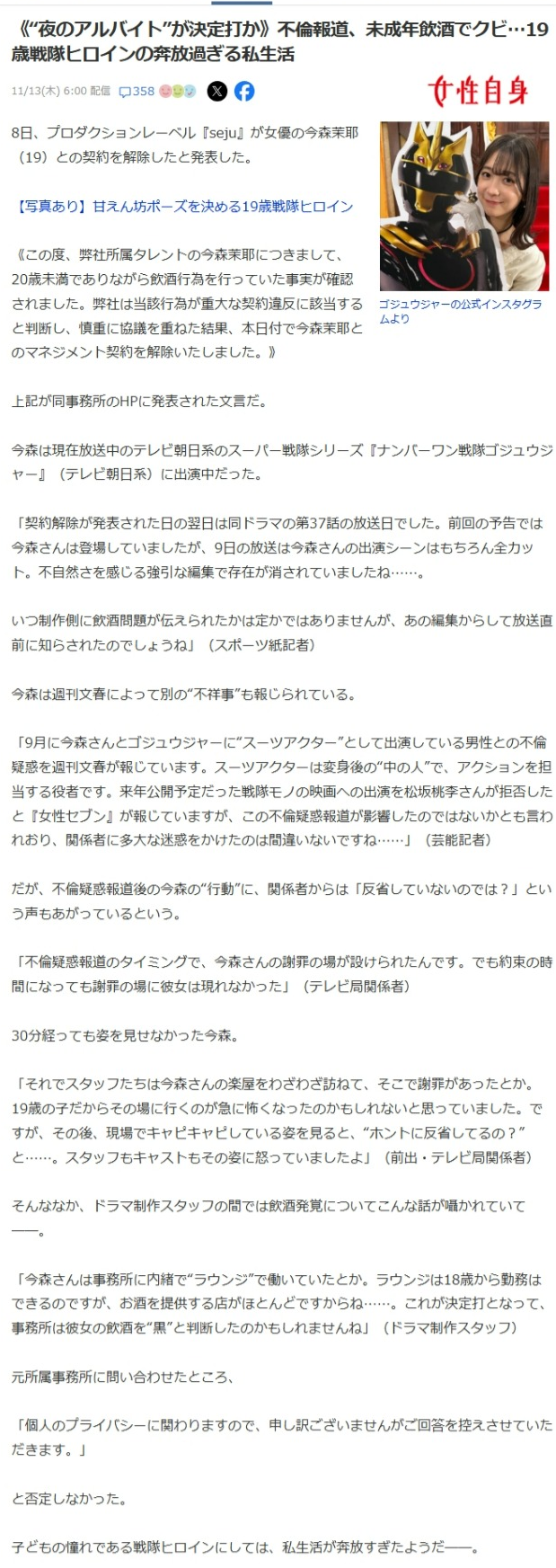 | … | 43無念Nameとしあき25/11/16(日)07:40:00No.1366458968そうだねx5>メディアごとに濁してるけどラウンジでバイトしてて他のキャストと一緒に飲酒したのを記者に撮られてたっぽい |