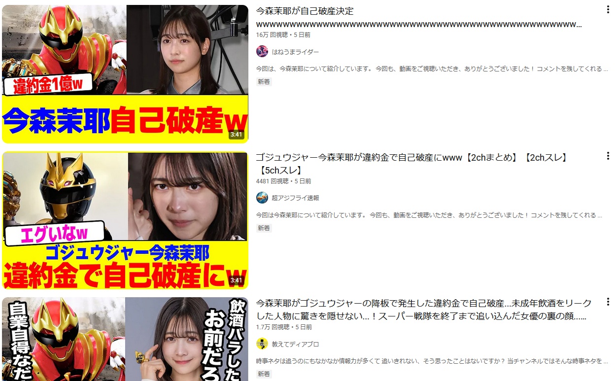 | … | 332無念Nameとしあき25/11/16(日)13:01:54No.1366518291+>>今森のせいで番組から東洋水産とかスポンサーが離れたって話が本当ならすごい金額の賠償が待ってるから強気ではいられないと思うけど |