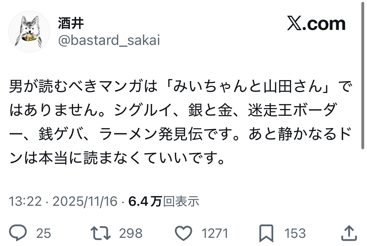 | … | 75無念Nameとしあき25/11/16(日)21:02:46No.1366637091そうだねx1>馬鹿野郎〜! |