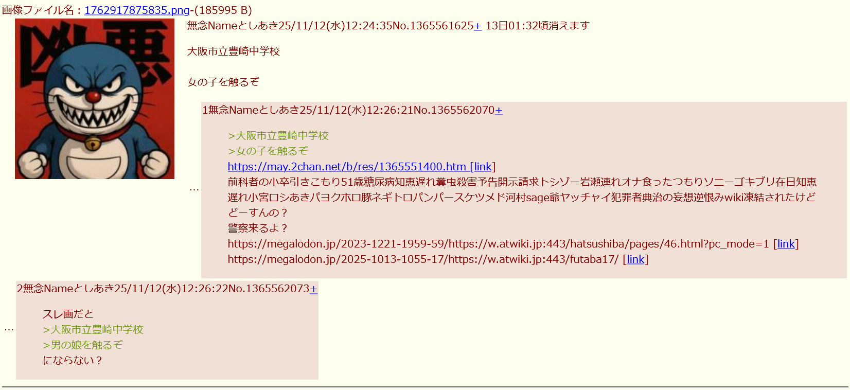 | … | 24無念Nameとしあき25/11/16(日)19:29:40No.1366606837そうだねx4 1763288980645.png-(289926 B) 本当に存在する中学校の名前出してセクハラ予告する奴が正義ねぇ… |