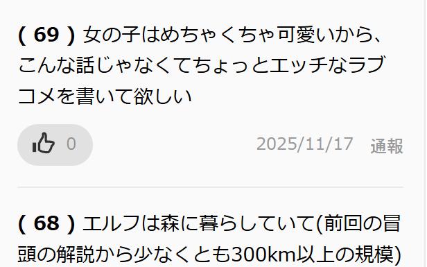 | … | 70無念Nameとしあき25/11/17(月)04:30:22No.1366714142そうだねx1エルフは主人公にあんまし魅力感じないけどなんとなく読めてはいる |