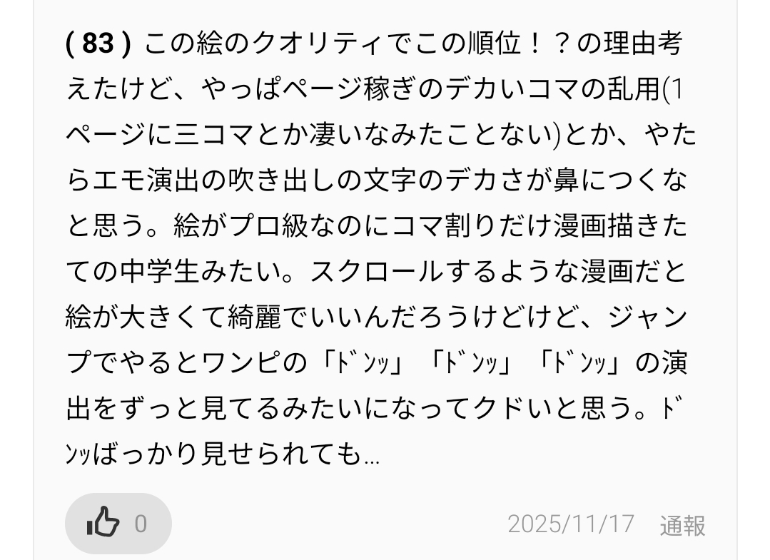 | … | 169無念Nameとしあき25/11/17(月)10:06:10No.1366735821+ 1763341570809.jpg-(246630 B) 1ページ3コマどころか2ページ1コマしかもコピペとか平気でやってたジャンプラでは日常茶飯事やぞ |