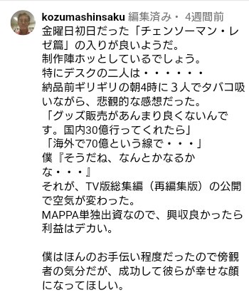 | … | 674無念Nameとしあき25/11/17(月)16:44:03No.1366792729そうだねx3興行が伸びれば伸びるほど横展開でデンジもレゼも幸せになるから年越しまでやれ |