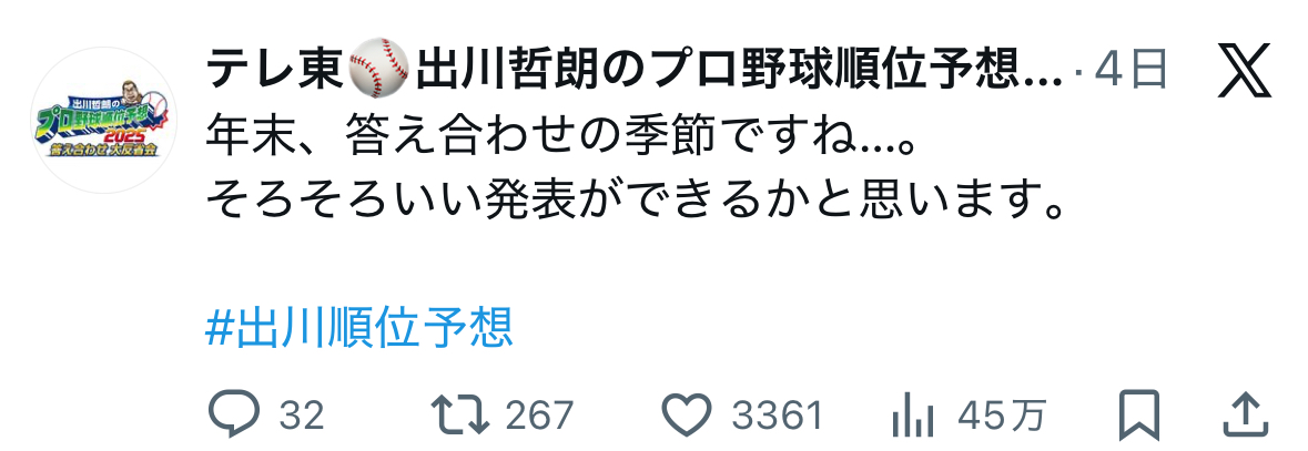 | … | 301無念Nameとしあき25/11/17(月)23:52:44 ID:gs.9JnpwNo.1366897029そうだねx1 1763391164843.jpg-(90121 B) >ところで皆さんなんかの野球系番組見てます? |
